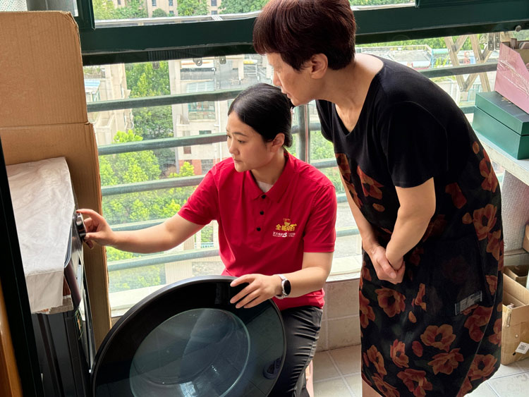 “劉阿姨,您放心,這款洗衣機的自清潔功能我教您操作三次了,您記不住的話,我把步驟寫在卡片上貼在機器上?!?月22日下午,金艷在顧客家正手把手教老人使用新購的洗衣機,額角的汗珠順著臉頰滑落,她卻顧不上擦。作為百大電器臨泉路店商場的主管,這樣的場景在她10年的職業(yè)生涯中,早已是家常便飯。