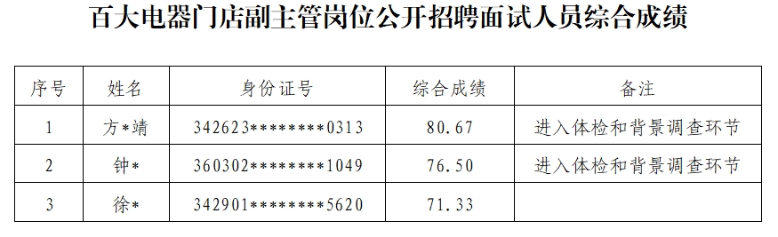 百大電器門店副主管崗位公開招聘面試工作已結(jié)束,現(xiàn)將綜合成績等有關(guān)事項公告如下: